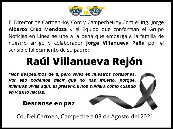 El Director de CarmenHoy.Com y CampecheHoy.Com el Ing. Jorge Alberto Cruz Mendoza y el Equipo que conforman el Grupo Noticias en Línea se une a la pena que embarga a la familia de nuestro amigo y colaborador Jorge Villanueva Peña por el sensible fallecimiento de su padre: