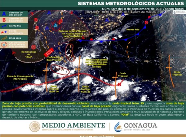 Este día, una zona de baja presión con probabilidad de desarrollo ciclónico asociada con la onda tropical Núm. 29 se localizará sobre el Golfo de Tehuantepec; una segunda zona de baja presión con potencial ciclónico se desplazará hacia el suroeste del Golfo de México e interaccionará con un canal de baja presión en esa región; dichos sistemas originarán lluvias puntuales torrenciales en Veracruz y Oaxaca, lluvias fuertes a intensas sobre el noreste, oriente, sur y sureste del país, así como en la Península de Yucatán, las cuales podrían generar incremento en los niveles de ríos y arroyos, deslaves e inundaciones.