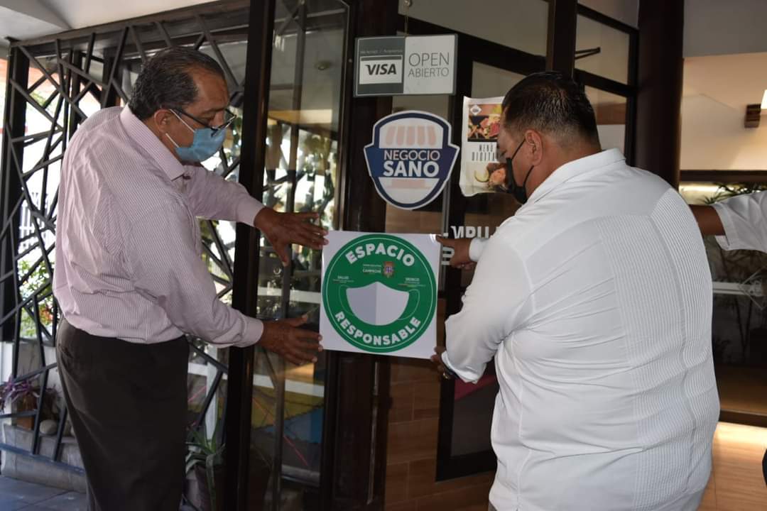 En representación del secretario José Antonio del Río González, el subsecretario Carlos Arjona Gutiérrez hizo la entrega del distintivo, acompañado del Director de Desarrollo Social y Económico municipal, Alberto Can Sánchez, Carlos García de COPRISCAM Carmen y Jessica León Damián, del INDEMIPYME.