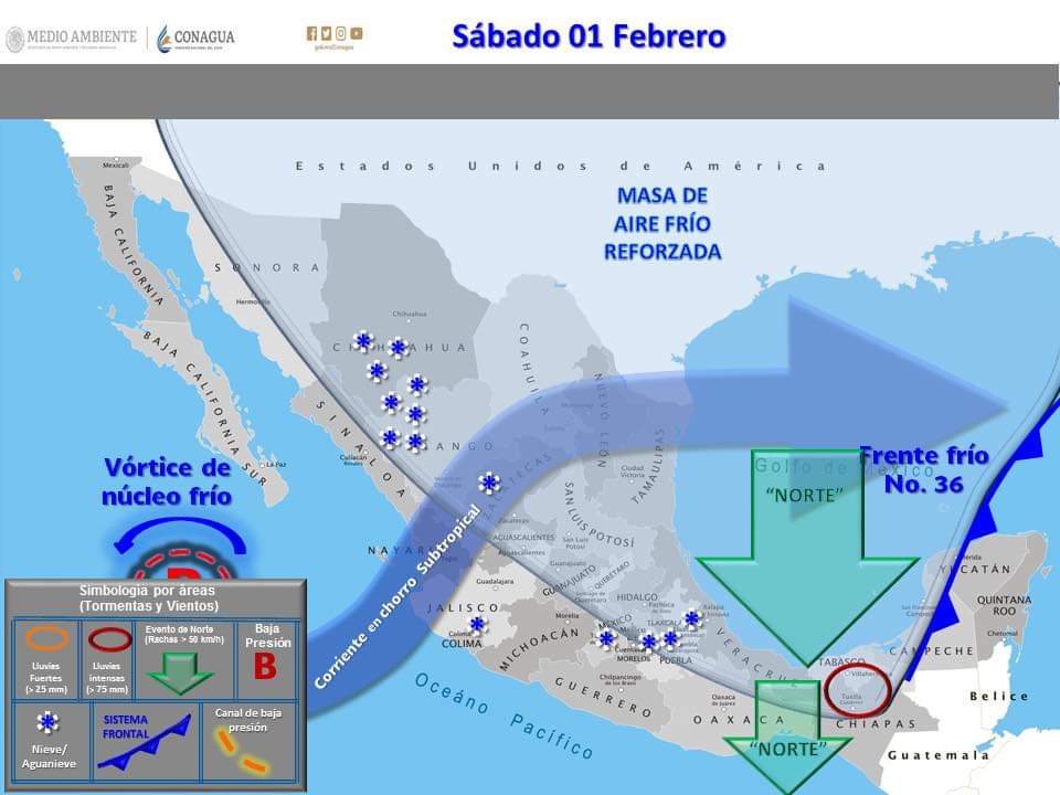 Para hoy el frente frío No. 36 ingresará a la península de Yucatán, generando condiciones de cielo medio nublado a nublado en la mayor parte de nuestra región, con probabilidad de lluvias en algunos puntos del municipio, así como rachas de viento de hasta 60 km/hr en la costa.