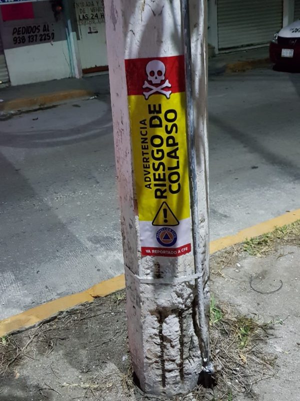La Dirección de Protección Civil Carmen, a cargo de Julio Villanueva Peña, en aras de la prevención de riesgos y como una función prioritaria de la misma, exhorta a la comunidad en general a tomar precauciones por riesgo de colapso ante el evidente deterioro que presentan alrededor de 200 estructuras de postes de la Comisión Federal de Electricidad (CFE).