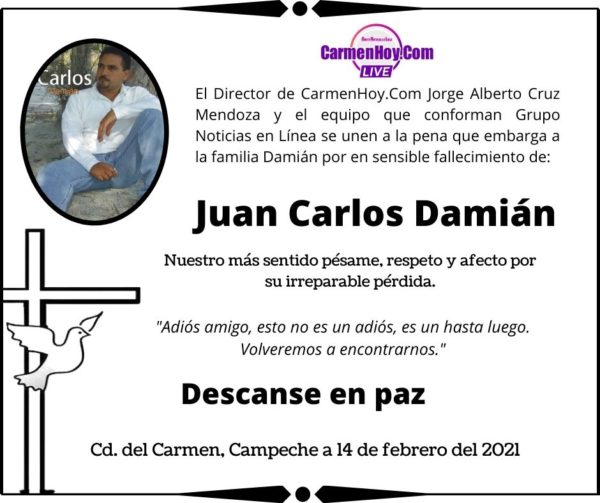 El Director de CarmenHoy.Com Jorge Alberto Cruz Mendoza y el equipo que conforman Grupo Noticias en Línea se unen a la pena que embarga a la familia Damián por en sensible fallecimiento de: