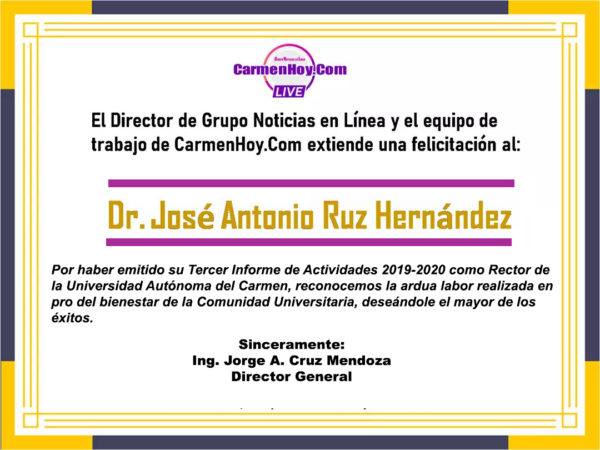Por haber emitido su Tercer Informe de Actividades 2019-2020, como Rector de la Universidad Autónoma del Carmen, reconocemos la ardua labor realizada en pro del bienestar de la Comunidad Universitaria, deseándole el mayor de los éxitos.