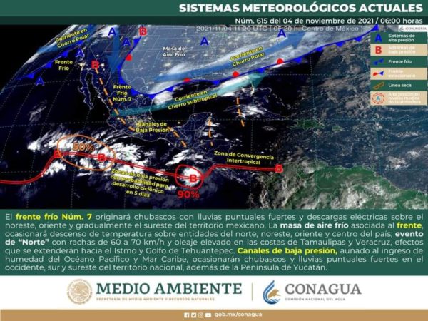 Este día, el frente frío Núm. 7 recorrerá el noreste, oriente y gradualmente el sureste del territorio mexicano, en su recorrido originará chubascos con lluvias puntuales fuertes, acompañadas de descargas eléctricas en dichas regiones. La masa de aire frío asociada al frente, ocasionará descenso de temperatura sobre entidades del norte, noreste, oriente y centro del país, así como evento de “Norte” con rachas de 60 a 70 km/h, además de oleaje elevado en las costas de Tamaulipas y Veracruz, efectos que se extenderán hacia el Istmo y Golfo de Tehuantepec. Por otra parte, canales de baja presión, aunado al ingreso de humedad del Océano Pacífico y Mar Caribe, ocasionarán chubascos y lluvias puntuales fuertes en el occidente, sur y sureste del territorio nacional, además de la Península de Yucatán.