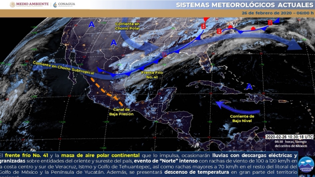 Masa de Aire Frío y Frente Frío No 41 estarán llegando a Campeche este miércoles por la tarde dejando sentir sus efectos inicialmente en los municipios costeros, y posteriormente por el resto de la entidad. Previo arribo de la línea frontal, desde primera hora de la tarde, nublados y lluvias se harán presentes, mismas que serán de intensidad moderada a fuerte en gran parte de la entidad, especialmente en los municipios del Oriente y Sur del Estado donde no se descarta alguna lluvia muy fuerte.