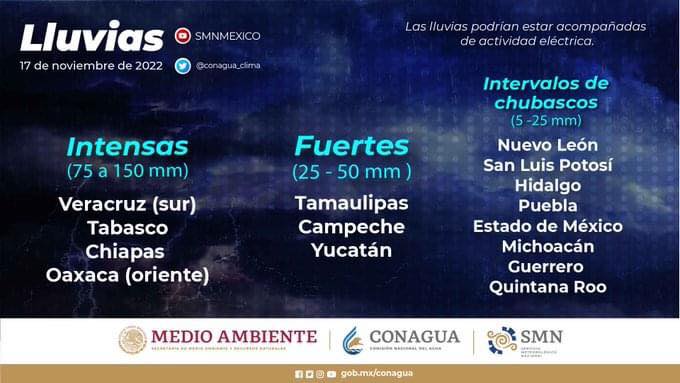Intervalos de chubascos con lluvias localmente fuertes en Campeche y Yucatán.