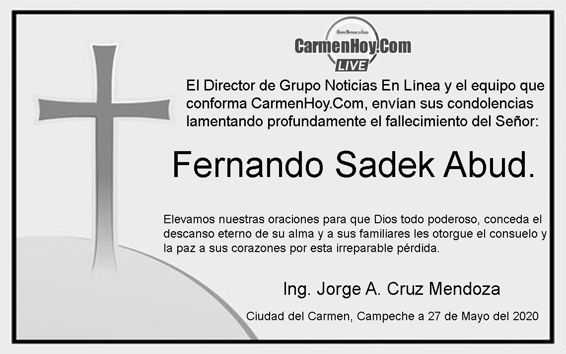 El Director de Grupo Noticias En Línea y el equipo que conforma CarmenHoy.Com, envían sus condolencias y lamentan profundamente el fallecimiento del Señor: