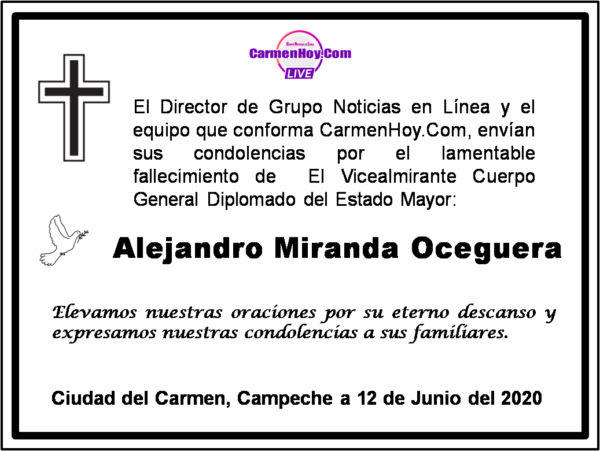 El Director de Grupo Noticias en Línea y el equipo que conforma CarmenHoy.Com, envían sus condolencias por el lamentable fallecimiento de El Vicealmirante Cuerpo General Diplomado del Estado Mayor: