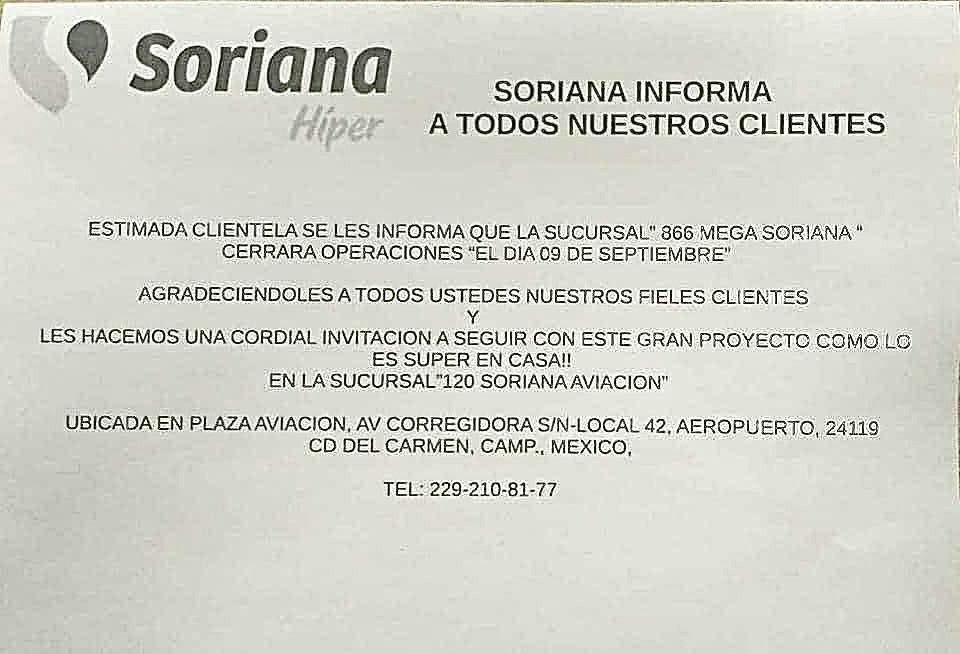 Mega-Soriana’ Cd del Carmen; cerrará sus puertas el próximo 9 de septiembre.