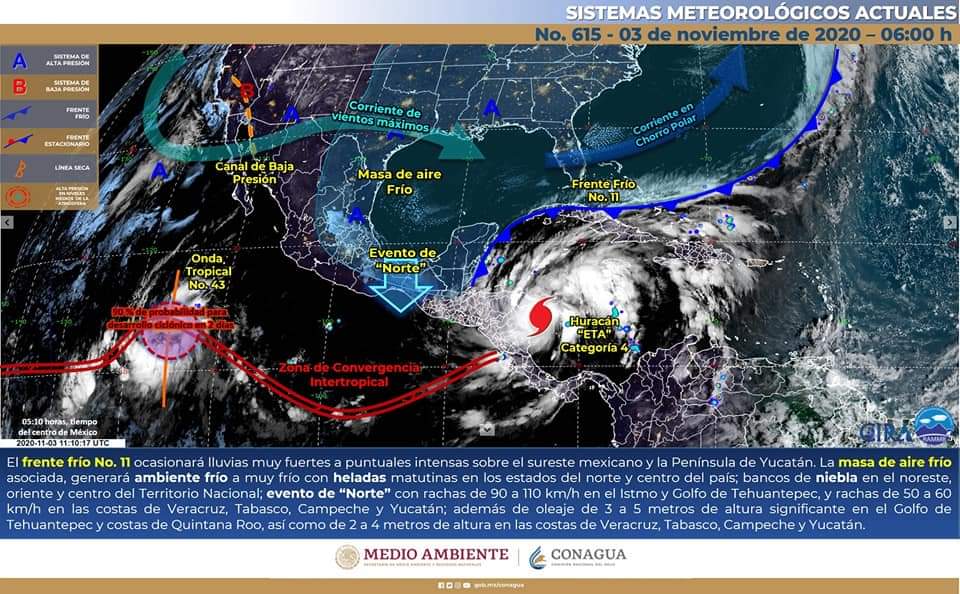 Eta continúa como Huracán categoría 4 en la escala #SaffirSimpson. Se localiza a 50 km al sur-sureste de Puerto Cabezas, Nicaragua, y a 745 km al sureste de Puerto Costa Maya, Quintana Roo.