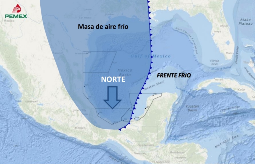 De acuerdo a modelos de pronóstico meteorológico, un nuevo Frente Frío ingresará al noroeste del Golfo de México durante la noche del miércoles 30, se espera que tenga un rápido desplazamiento sobre el litoral del Golfo, extendiéndose sobre el centro de Veracruz el jueves por la mañana y en la Sonda de Campeche a partir de la tarde; por su parte, la masa de aire que impulse al sistema frontal ocasionará un fuerte y generalizado evento de Norte, previéndose rachas de 100 Km/h y oleaje de hasta 13 a 15 ft frente a la costa de Veracruz.