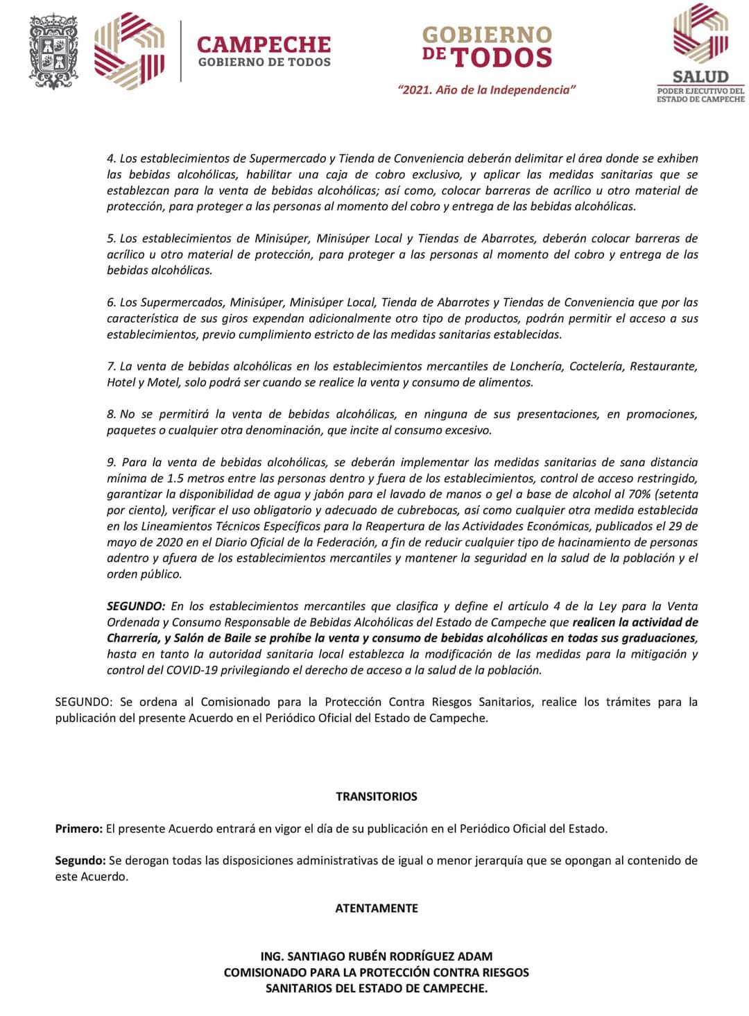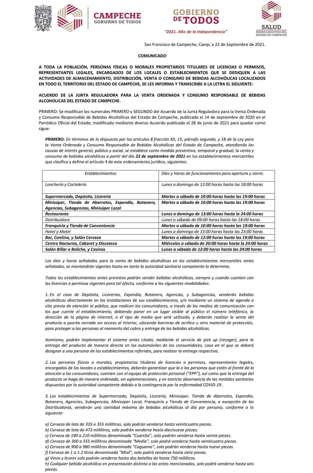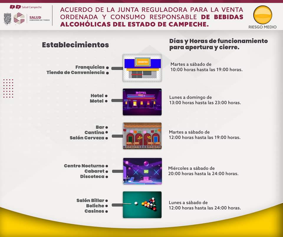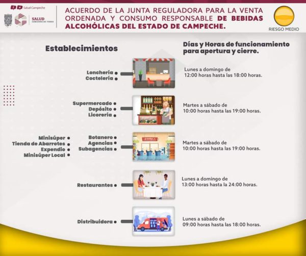 Días y horarios de funcionamiento para apertura y cierres, de acuerdo a la Junta Reguladora para la Venta Ordenada y Consumo Responsable de Bebidas Alcohólicas del Estado de Campeche.