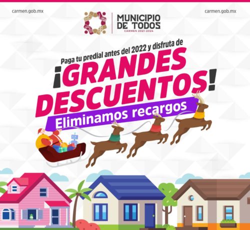 El Gobierno Municipal de Carmen te invita a pagar tu predial antes de que concluya este año a fin de que aproveches la ELIMINACIÓN DE RECARGOS y descuentos adicionales, en el caso, de las personas con discapacidad, pensionados y adultos de la tercera edad, además de MESES SIN INTERESES CON BBVA.