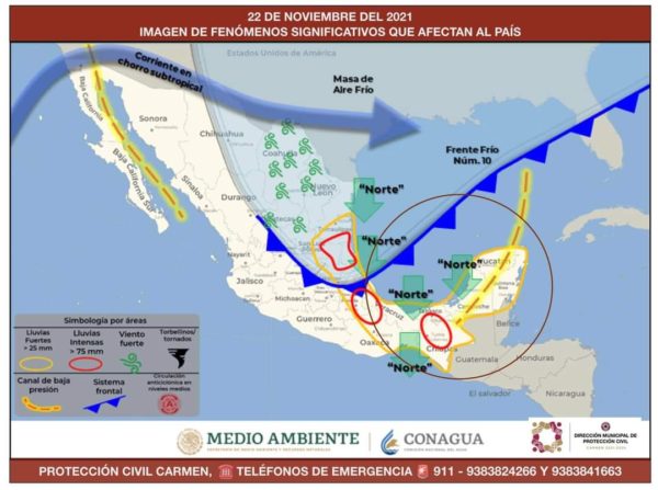 Viento: de dirección norte – noreste de 15 a 25 km/h, y rachas de 40 km/h sobre la sonda de Campeche.