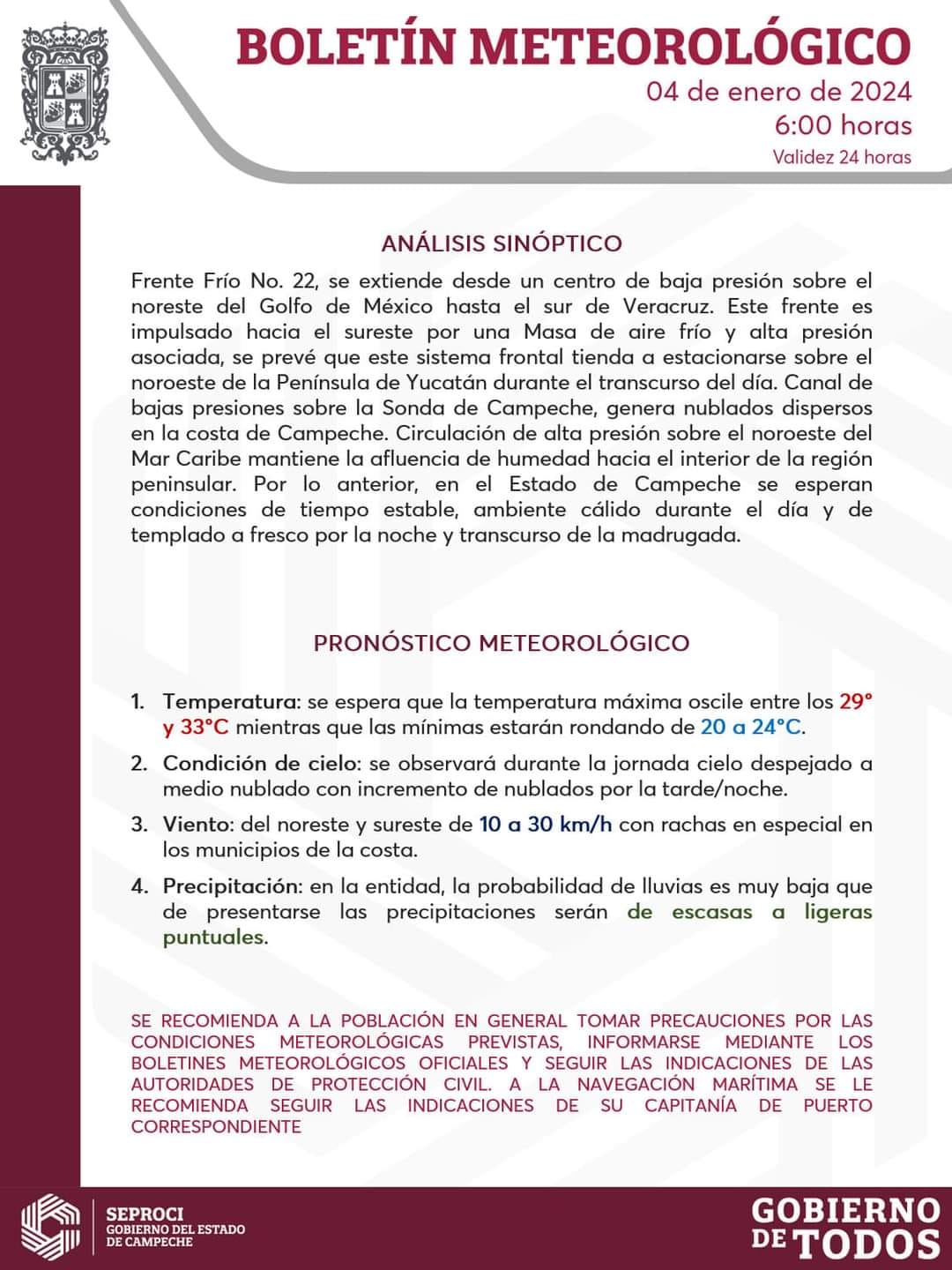 Por otra parte, se monitorea al FrenteFrio No. 22 que será reforzado por una nueva masa de aire polar, extendiéndose este día sobre la porción central del Golfo de México.