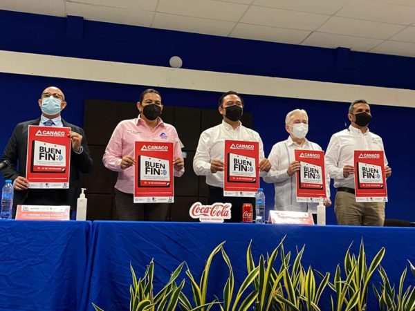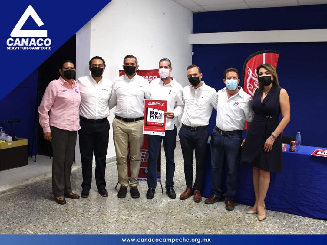 El Lic. Carlos Omar Tapia López, Presidente de la Cámara Nacional de Comercio, Servicios y Turismo de Campeche, encabezó la Rueda de Prensa: Buen fin 2021 acompañado de la Lic. Josefina Ojeda Martínez, Presidenta de la Canaco Servytur Ciudad Del Carmen, el Lic. Fernando Gamboa Rosas, Secretario de Desarrollo Económico del Poder Ejecutivo del Estado de Campeche (Sedeco Campeche), el Lic. Mauricio Arceo Piña, Secretario de Turismo Campeche y el Lic. Alfredo Torres Campo, Director de Zona – Oficina de Defensa del Consumidor Zona Golfo-Sureste (PROFECO).