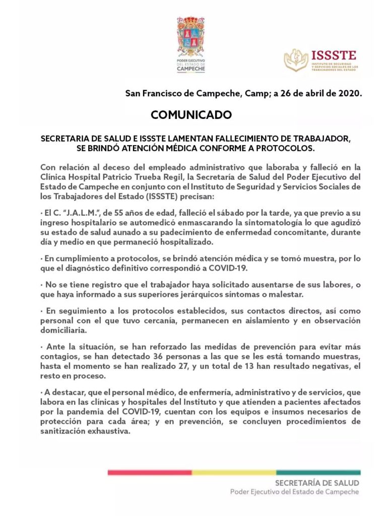 La Secretaría de salud e ISSSTE lamenta el fallecimiento de trabajador. El C. J.A.L.M. De 55 años falleció este sábado por la tarde, ya que previo a su ingreso hospitalario de automedicó enmascarando la sintomatología lo que agudizó su estado de salud.