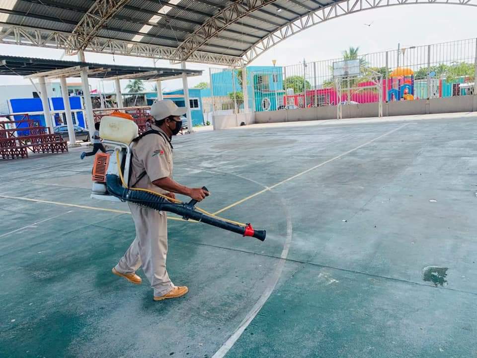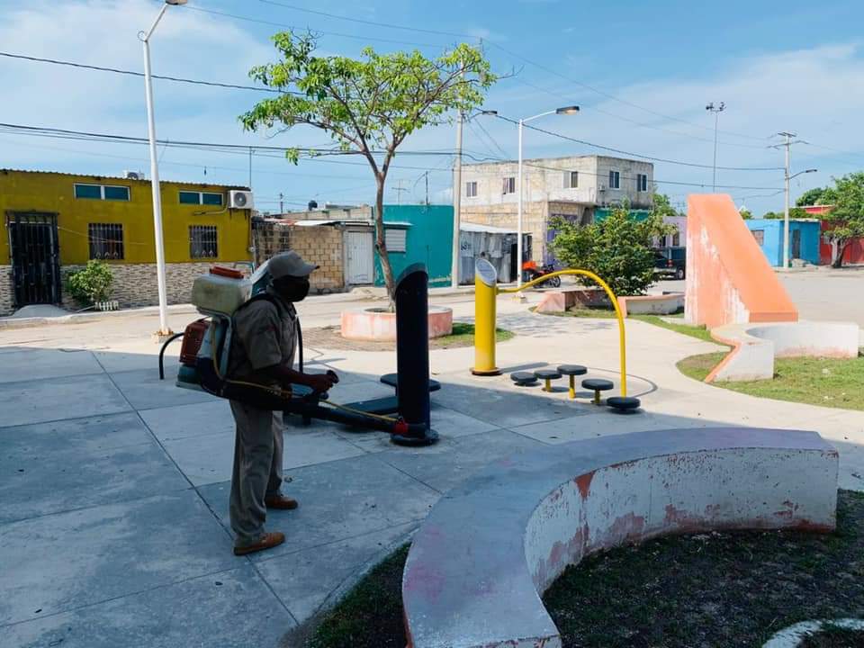 En Carmen se realizaron trabajos de sanitización en espacios públicos donde serán instaladas las casillas este 6 de junio como parte del cuidado a la salud y de protección a la población que participará en los comicios de este domingo.