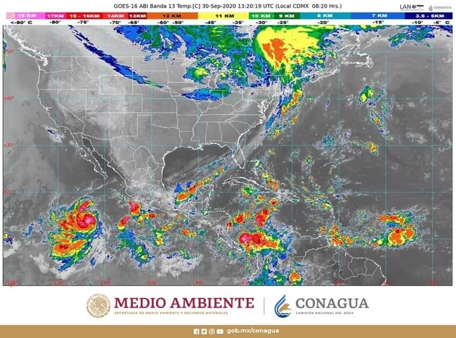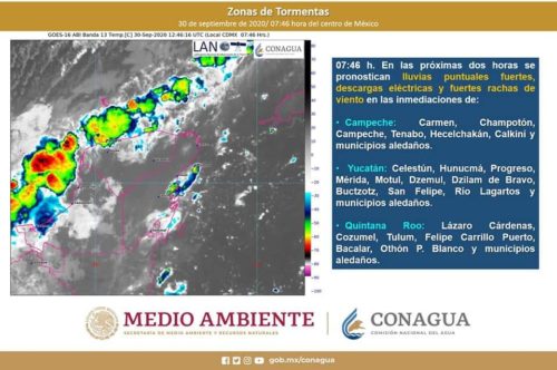 sobre la Península de Yucatán y el sureste de México, originará lluvias puntuales extraordinarias en Chiapas (norte) y Tabasco; torrenciales en Oaxaca (noreste), Veracruz (sur) y Campeche; intensas en Yucatán, así como muy fuertes en Quintana Roo, todas con descargas eléctricas, rachas de viento y posibles granizadas durante las tormentas.