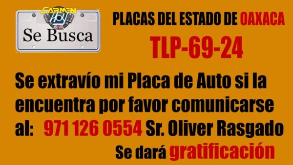 SE BUSCA PLACA – El número de la placa es TLP-69-24 del Estado de Oaxaca, si la encuentra por favor comunicarse al número 971 1260554 con el Sr. Oliver Rasgado, el lugar de extravío av. camarón y calle Justo sierra, se dará Gratificación.