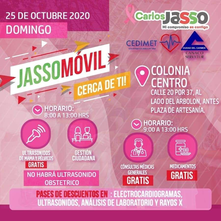 La lucha contra el cáncer de mama es de todos y para sumar más conciencia llevaré Ultrasonidos de mama, pélvicos y todos los servicios médicos gratuitos del #JassoMovil a la Colonia Centro este 25 de octubre.