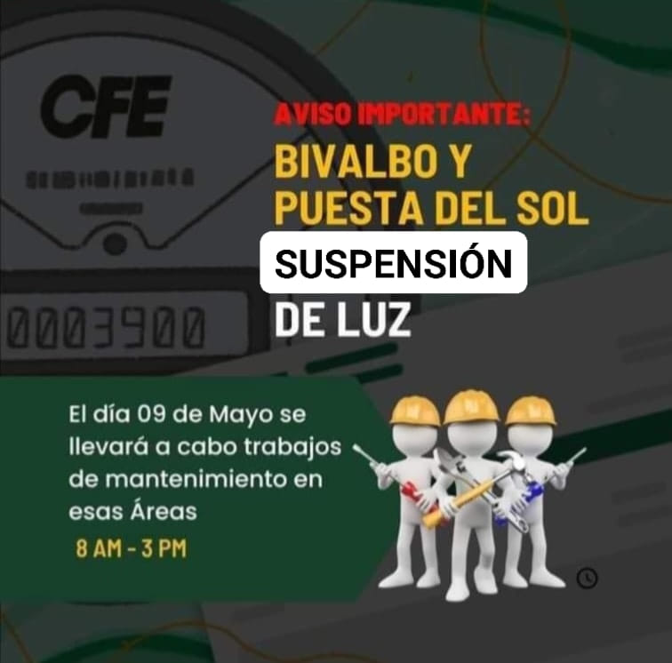 Se informa a los habitantes de las col. BIVALVO y PUESTA del SOL la #SUSPENSIÓN del suministro eléctrico en horario de 8:00 a.m. a ️3:00 p.m. derivado del cambio de un poste de #CFE que fue chocado y representa un riesgo