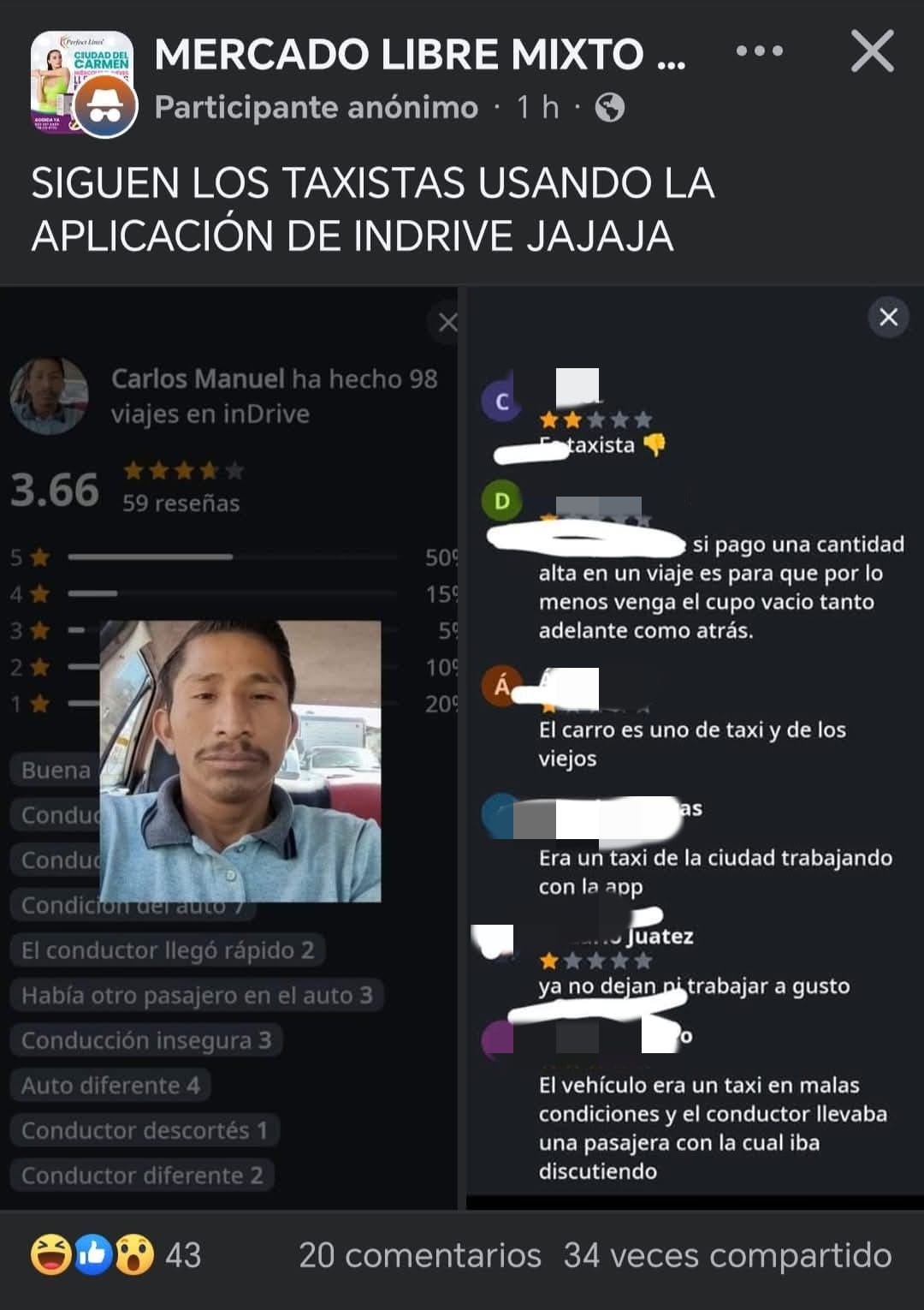 Mientras el “Gallo”Alba pseudo líder del Sindicato de Taxistas ha emprendido una ilegal caza en contra de los prestadores de servicio de plataforma específicamente INDRIVE, los mismos taxistas están dando servicio en las unidades viejas del servicio de Taxis, usuarios han mencionado que al momento de usar los servicios de la plataforma se han topado que llegan TAXIS (con logotipos, número económico y placas de servicio público) a recogerlos, aunado a esto los Taxistas traen servicios y realizan la recolecta de más pasaje durante el trayecto al destino del usuario de Indrive, esto a provocado descontento en la ciudadanía.
