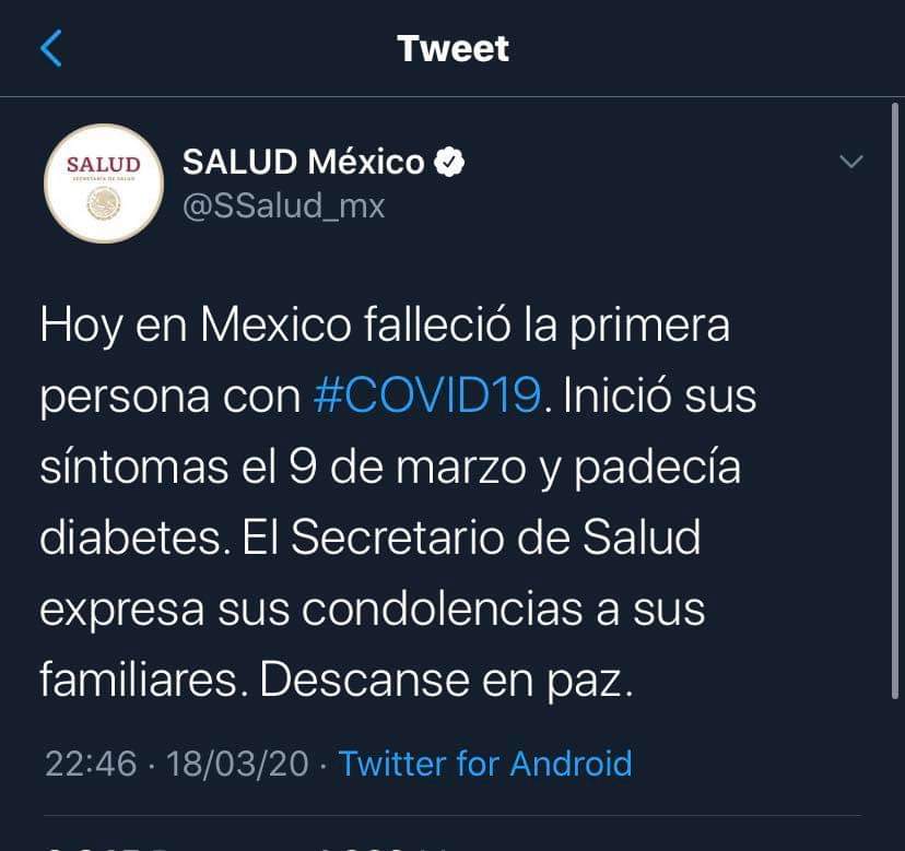 A las 10:46 de la noche, la Secretaría de Salud de México confirmó la primera muerte a causa del Covid-19.