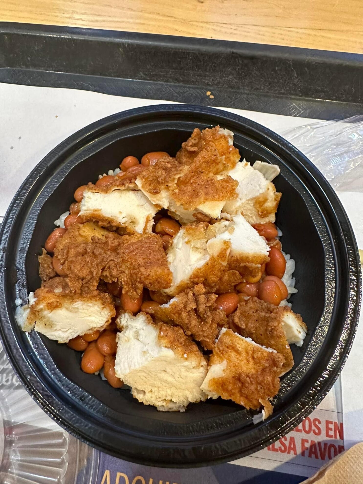 Así que le dije al chico de la caja, que yo iba a pagar el combo del caballero, quien no quiso pollo, porque dice que casi no come carne. Así que solo aceptó el arroz y las habichuelas.
