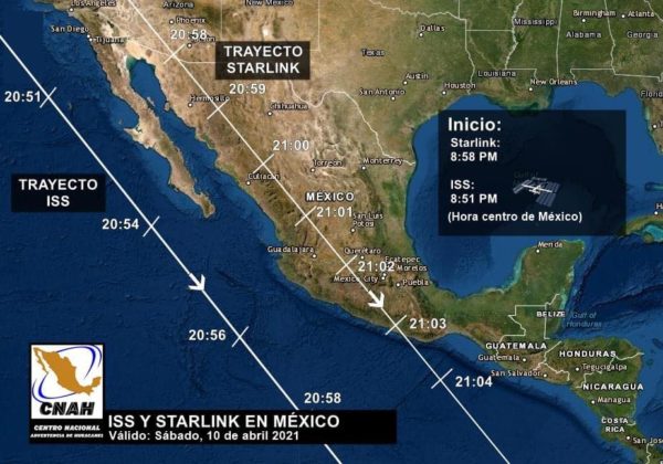 Comenzará a observarse a partir de las 8:58 PM sobre el noroeste del país mientras avanzan los 60 satélites sobre: Sonora, Durango, Sinaloa, Zacatecas, Aguascalientes, Nayarit, Jalisco, Colima, Guanajuato, Querétaro, Edomex, Morelos, CDMX, Michoacán y Guerrero.