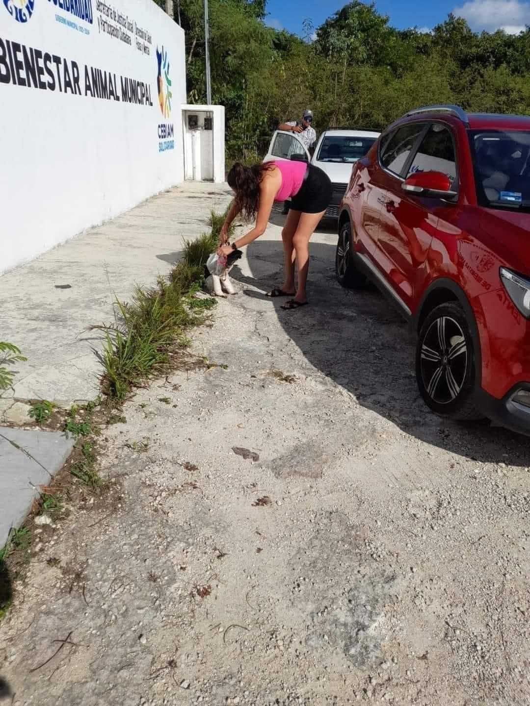 En las fotografías se aprecia el momento cuando la mujer desciende de su vehículo y deja a su mascota a un costado de un albergue de animalitos en #playadelcarmen