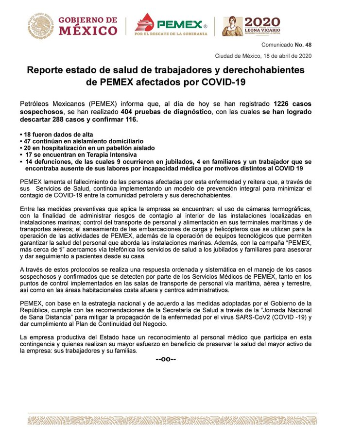“PEMEX, con base en la estrategia nacional y de acuerdo a las medidas adoptadas por el Gobierno de la República, cumple con las recomendaciones de la Secretaría de Salud a través de la “Jornada Nacional de Sana Distancia” para mitigar la propagación de la enfermedad por el virus SARS-CoV2 (COVID -19) y dar cumplimiento al Plan de Continuidad del Negocio”, señaló la petrolera.