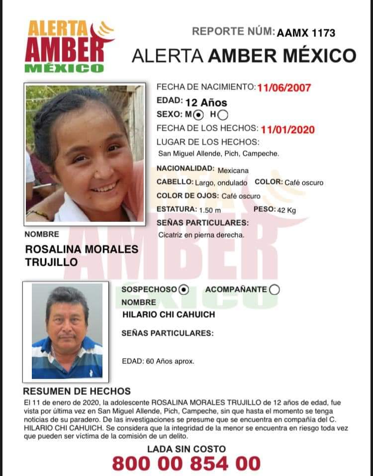 Continúa la #AlertaAmberMx de la niña ROSALINA MORALES TRUJILLO de 12 años de edad, quien fue vista por última vez en la comunidad de San Miguel Allende, Pich, Campeche, hasta el momento se desconoce de su paradero.