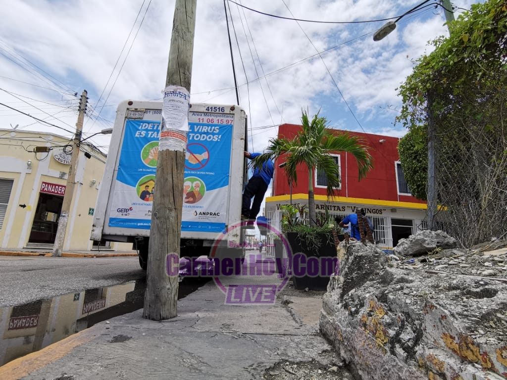 Hace unos momentos el conductor de un camión tipo Freightliner con matrícula de circulación CR-49-769 con registro en el Estado de Campeche fue detenido y presentado ante el agente del ministerio público por agentes municipales pues con la pesada unidad que manejaba, dañó un poste al grado de quedar a punto de caer.