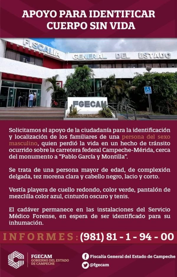 La Fiscalía General del Estado de Campeche (FGECAM), solicita el apoyo de la ciudadanía para que coadyuve en la identificación y localización de los familiares de una persona del sexo masculino, quien perdió la vida en un hecho de tránsito ocurrido sobre la carretera federal Campeche-Mérida, cerca del monumento a “Pablo García y Montilla”.