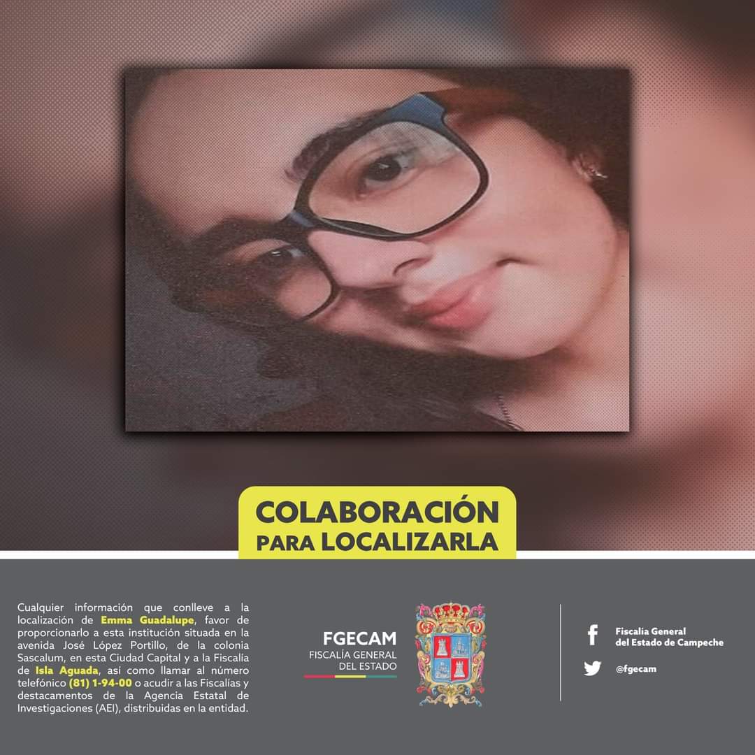 Cualquier información que conlleve a la localización de Emma Guadalupe, favor de proporcionarlo a esta institución situada en la avenida José López Portillo, de la colonia Sascalum, en esta Ciudad Capital y a la Fiscalía de Isla Aguada, así como llamar al número telefónico (81) 1-94-00 o acudir a las Fiscalías y destacamentos de la Agencia Estatal de Investigaciones (AEI), distribuidas en la entidad.