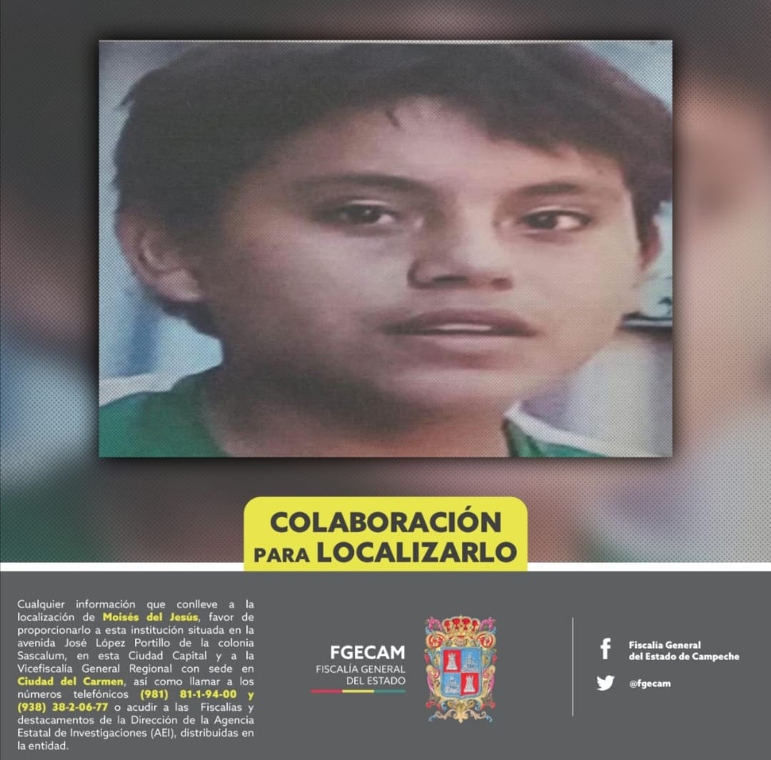 Cualquier información que conlleve a la localización de Moisés del Jesús, favor de proporcionarlo a esta institución situada en la avenida José López Portillo de la colonia Sascalum, en esta Ciudad Capital y a la Vicefiscalía General Regional con sede en Ciudad del Carmen, así como llamar a los números telefónicos (981) 81-1-94-00 y (938) 38-2-06-77 o acudir a las Fiscalías y destacamentos de la Dirección de la Agencia Estatal de Investigaciones (AEI), distribuidas en la entidad.