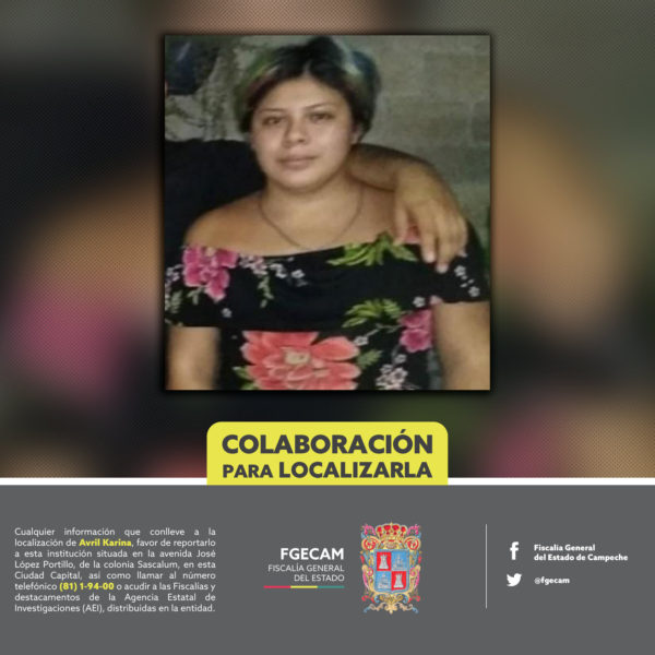 La FGECAM solicita el apoyo de la ciudadanía para que aporten datos que conlleven a la localización de la adolescente Avril Karina Cañetas Torres, quien salió a comprar un refresco, sin que hasta el momento haya retornado al hogar familiar.