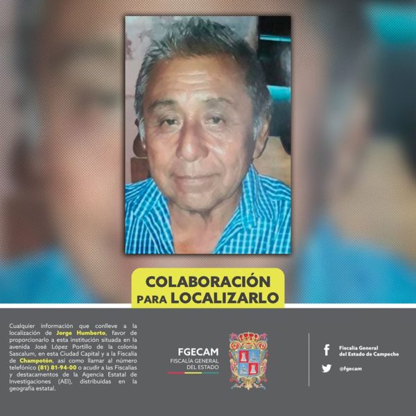 Cualquier información que conlleve a la localización de Jorge Humberto, favor de proporcionarlo a esta institución situada en la avenida José López Portillo de la colonia Sascalum, en esta Ciudad Capital y a la Fiscalía de Champotón, así como llamar al número telefónico (81) 81-94-00 o acudir a las Fiscalías y destacamentos de la Agencia Estatal de Investigaciones (AEI), distribuidas en la geografía estatal.