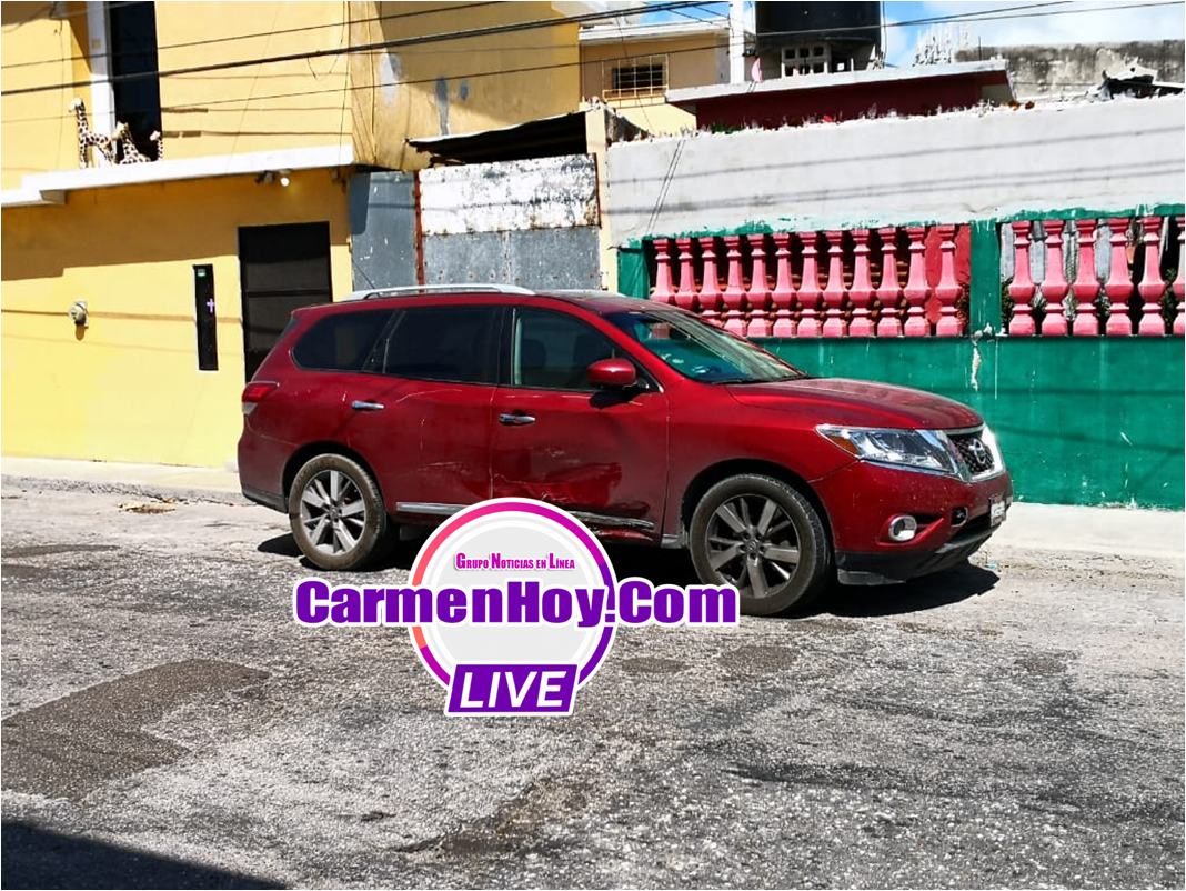 La camioneta responsable es de la marca Nissan Pathfinder color rojo vino con placas de circulación DJV-85-38 del Estado de Campeche mismo que terminó con una grande abolladura en la puerta del copiloto producto del fuerte impacto entre la motocicleta.