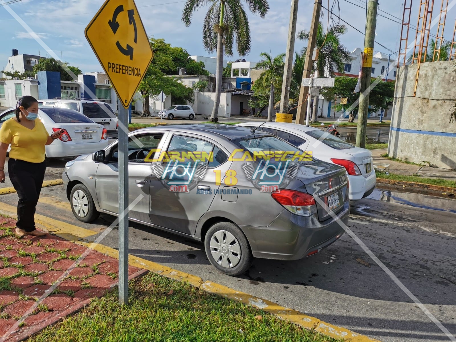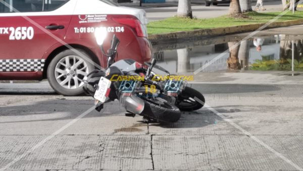 Un accidente que se registró alrededor de las 10:00 horas, en la glorieta de los delfines sobre la calle Corregidora por calle Concordia de la colonia aeropuerto, lugar donde el guiador de una motocicleta pulsar, color plata con negro y matrícula de circulación 25CUR3 del estado de Campeche circulaba dentro de la rotonda y de ir sobre la avenida Corregidora intento reincorporarse hacia la avenida Concordia, desafortunadamente la conductora de un vehículo Dodge Attitude, color plata con matrícula de circulación DJV-29-64 del estado de Campeche, que circulaba sobre la avenida Corregidora no respetó la preferencia de la rotonda e impactó el costado derecho al motociclista al que derribó y mandó al pavimento, con lesiones en el antebrazo izquierdo, la conductora dio reversa y trato de colocarse en una posición para que no la responsabilizarán.