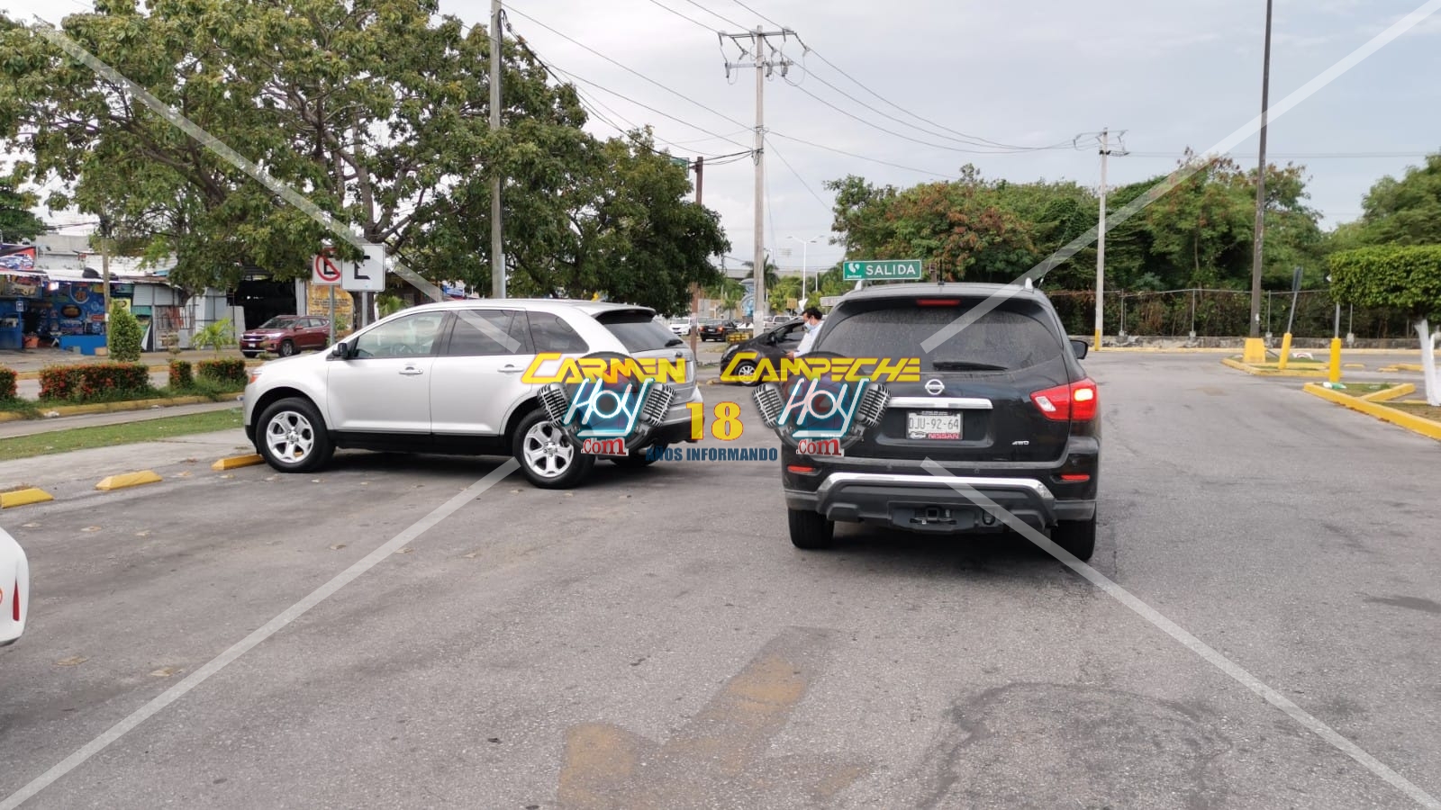 Lugar donde el conductor de una camioneta de lujo, Ford Edge, color plata con matrícula de circulación DJR-72-62 con registro en el estado de Campeche, realizaba maniobras de reversa para salir de su cajón de estacionamiento.