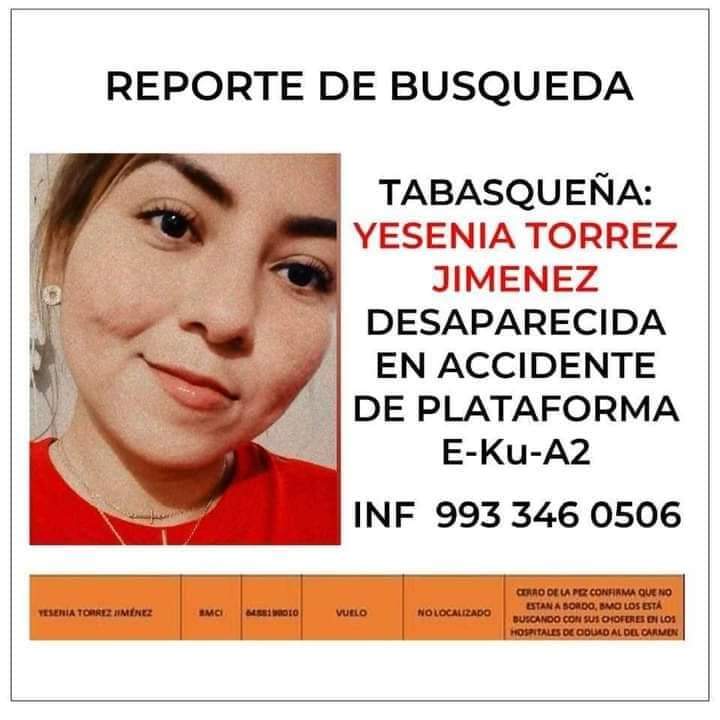 Siendo las 5:40 horas del lunes, las cuadrillas de búsqueda y rescate que trabajan en la siniestrada plataforma E-Ku-A2 ubicaron en cuarto de control los cuerpos calcinados de Yesenia Torres Jiménez y Ángel Esteban Raymundo trabajadores de la empresa Bufete de Monitoreo de Condiciones e Integridad (BMCI), dando informe al ministerio público de la Vicefiscalía de Justicia para que se realice el traslado de los restos a Ciudad del Carmen.