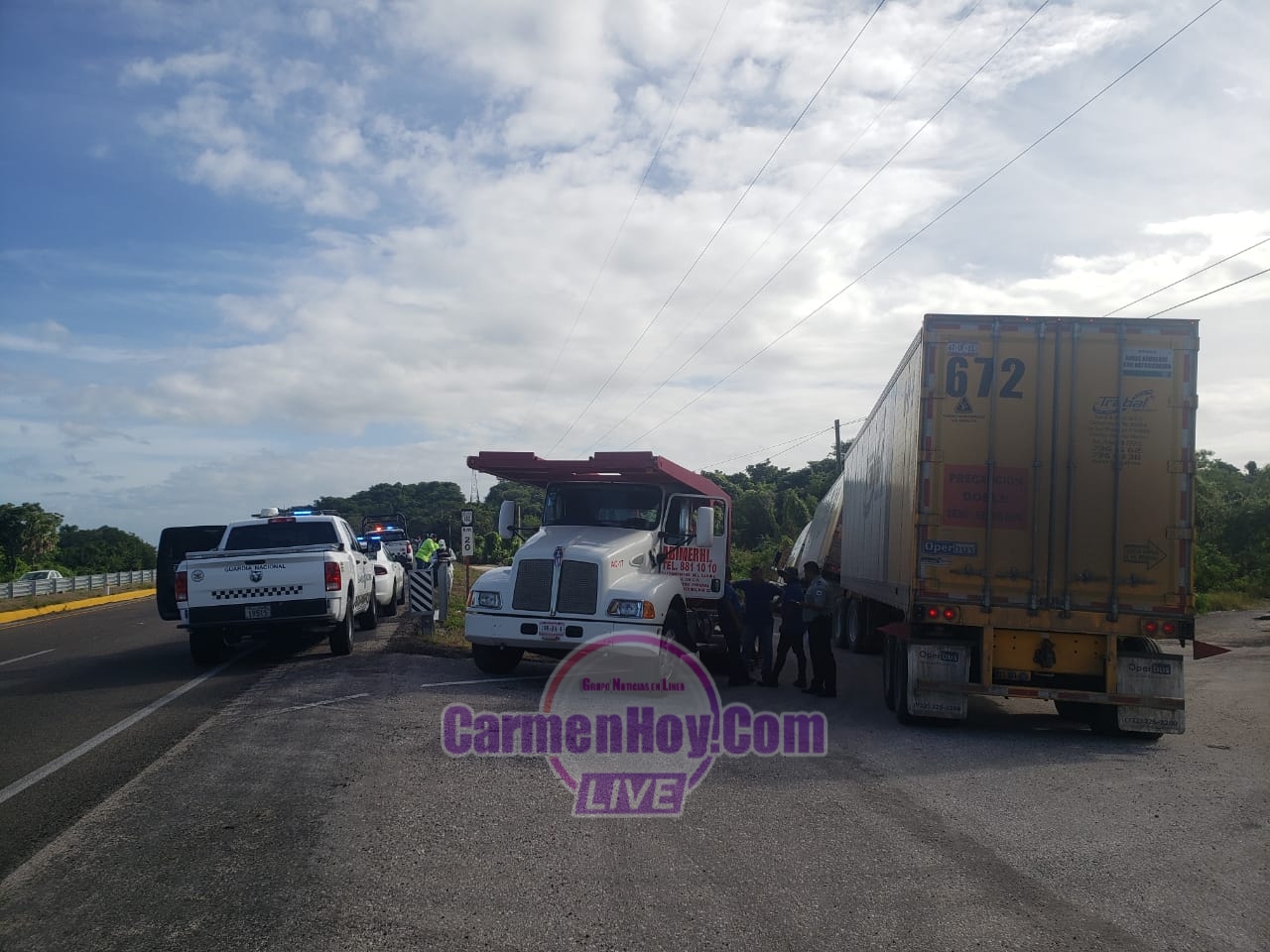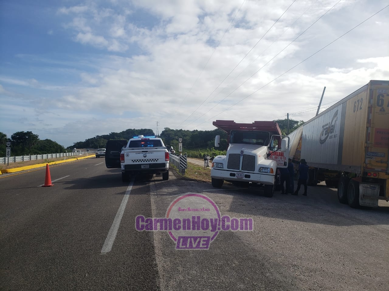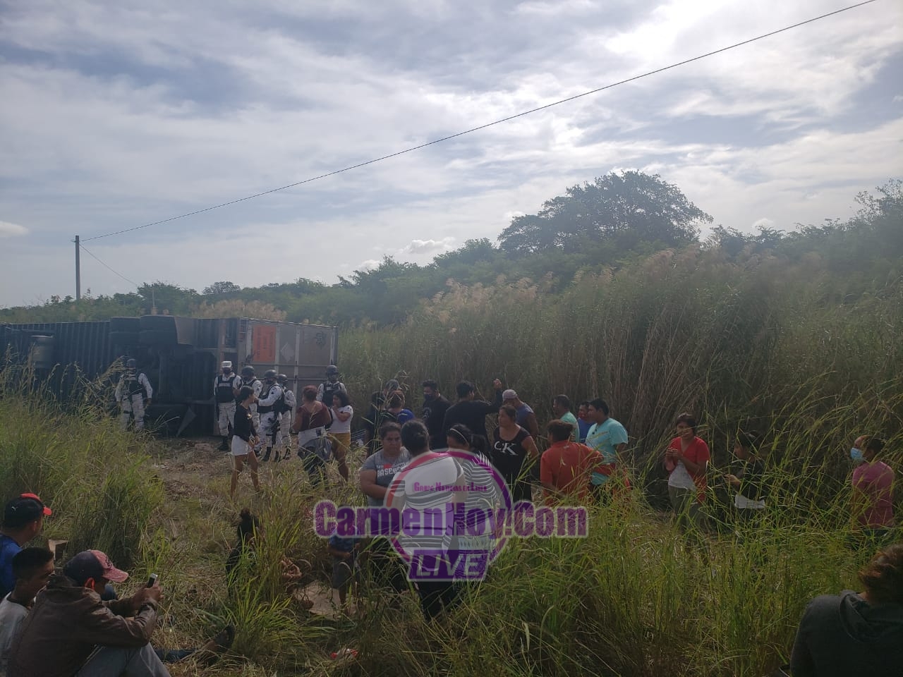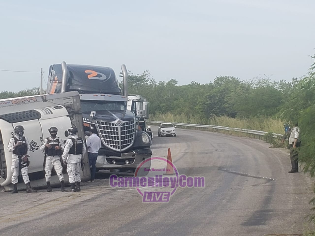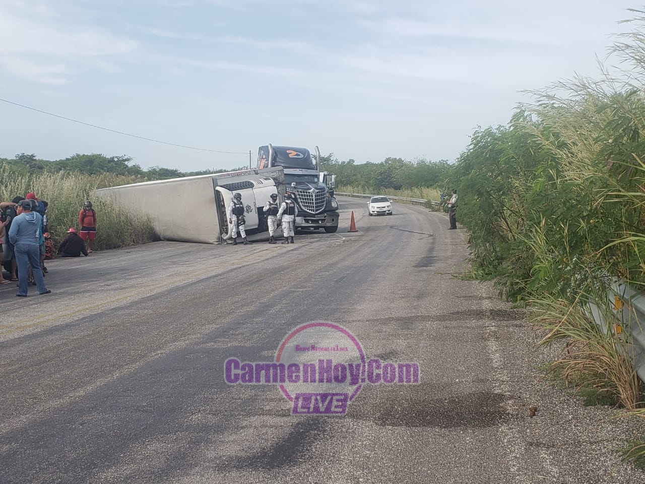 Un tráiler con productos refrigerados se salvó de ser rapiñado, luego de volcar en el kilómetro 122 de la carretera Matamoros- Puerto Juárez, rumbo a la Ciudad de Campeche cerca del complejo Akbal.