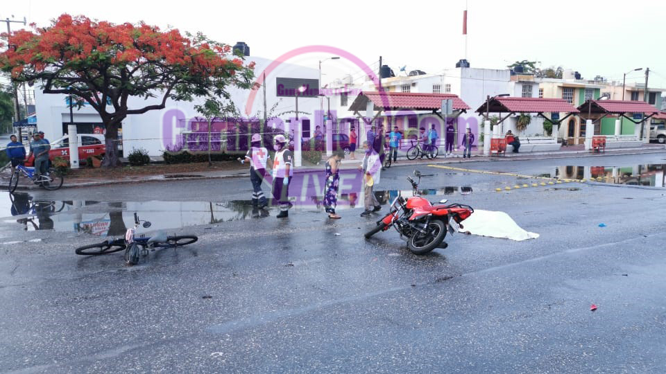 Pierde la vida una persona del sexo masculino quien se desplazaba en una bicicleta esto al ser violentamente arrollado por el motorista de un caballito de acero de la marca Italika FT250 con matrícula de circulación 69CTA6 con registro en el Estado de Campeche, el guiador asegurado por elementos de la Policía estatal preventiva y presentado ante la vicefiscalía.