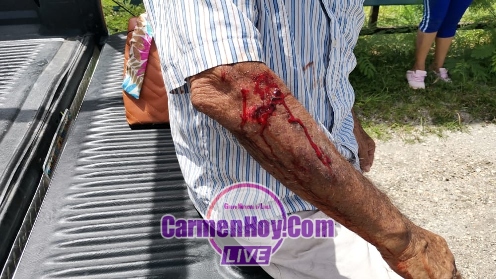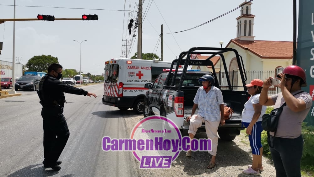 Sin percatarse que este cambio de carril terminara por ser un corte de circulación bruscamente al guiador de una motocicleta dinamo 110 con matrícula de circulación WHP8K con registro en el Estado de Campeche cuyo conductor un hombre mayor de 70 años terminó proyectándose de frente contra el costado lateral izquierdo para quedar tendido en el pavimento con lesiones en brazos y pies.