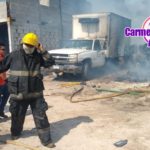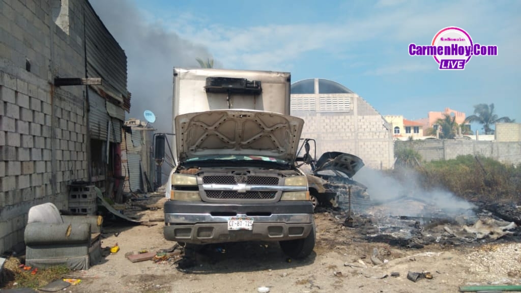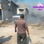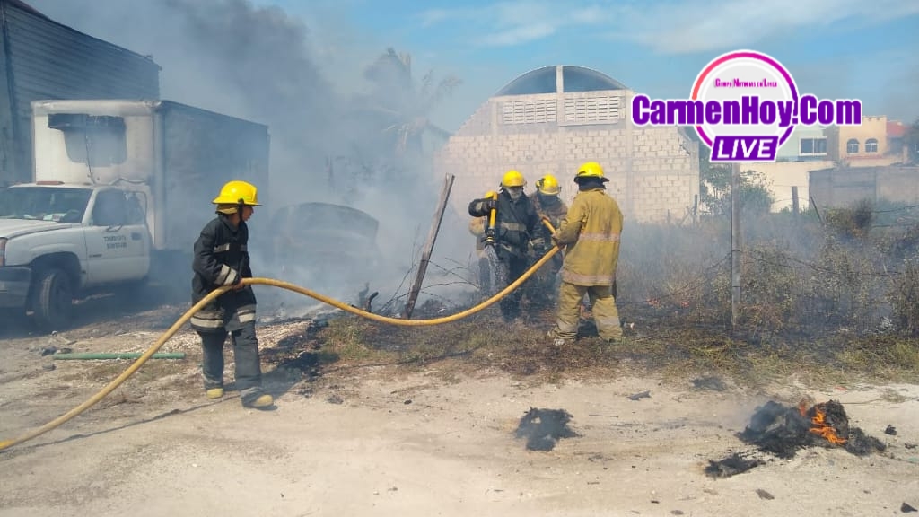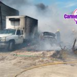 Se originó un fuerte incendio en un terreno ubicado en el kilómetro 13+500 de la carretera Carmen Puerto real en dónde está el momento 3 vehículos han terminado calcinados por las llamas y parte de una vivienda de un fraccionamiento que se encuentra pegado a este terreno donde se originó el incendio, en el lugar ya se encuentran los distintos cuerpos de emergencia como son bomberos locales, bomberos tácticos, protección civil.