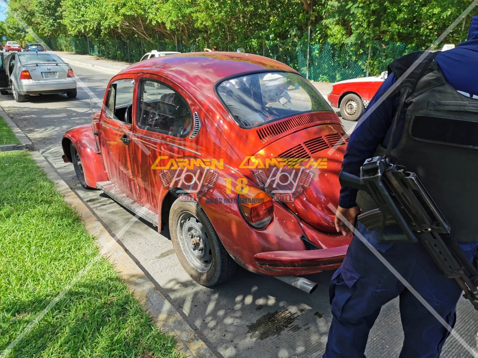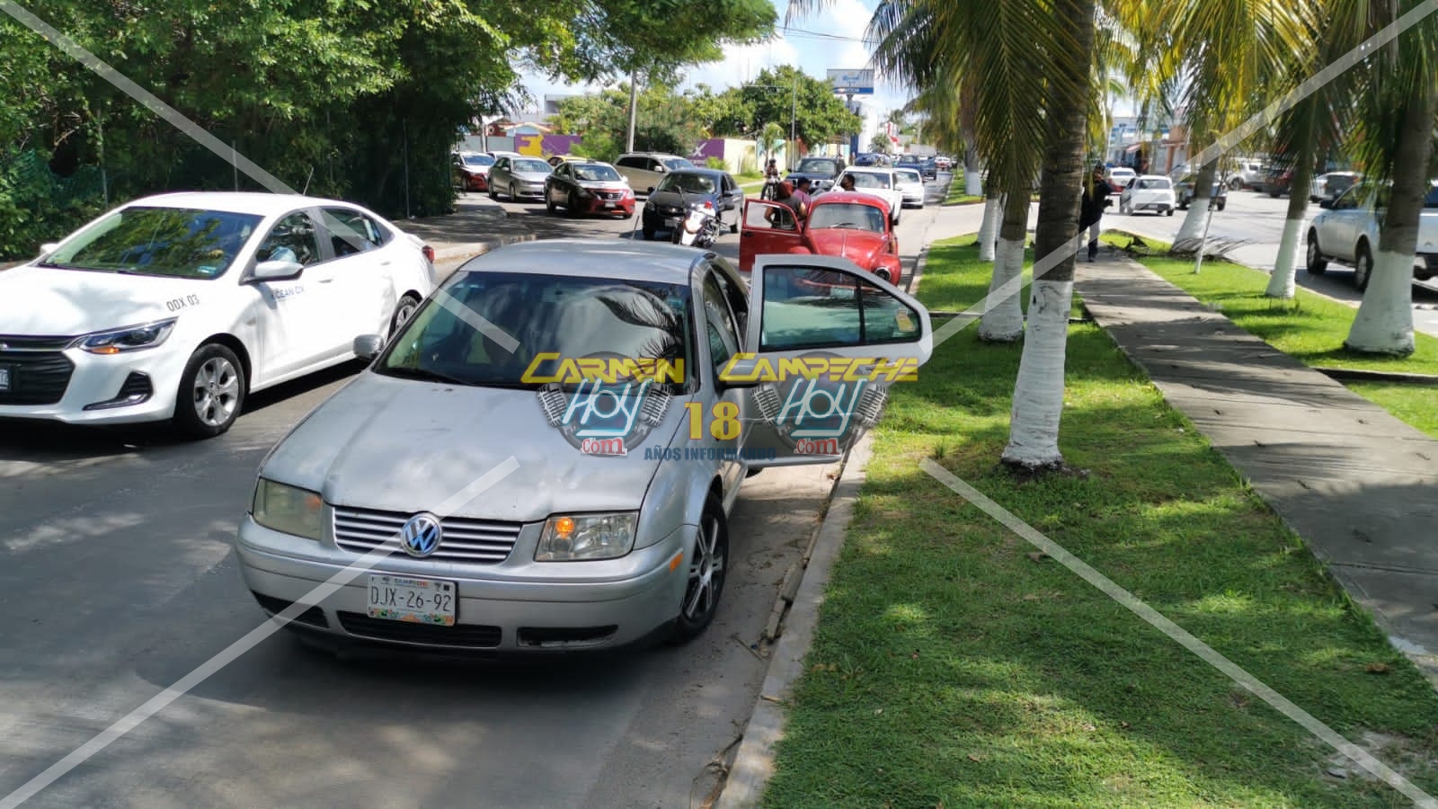Los hechos que se registraron alrededor de las 15:00 horas, sobre la avenida periférica Norte por calle 37 de la colonia independencia, lugar donde el conductor del vehículo particular Volkswagen Jetta, color plata, con matrícula de circulación DJX-26-92 del estado de Campeche salía de la calle 37 pero al hacerlo sin precaución colisionó contra el costado izquierdo de un vehículo Volkswagen Vocho, color rojo con matrícula de circulación DKC-37-80 del estado de Campeche, causándole daños de regular cuantía de una de las salpicaderas.