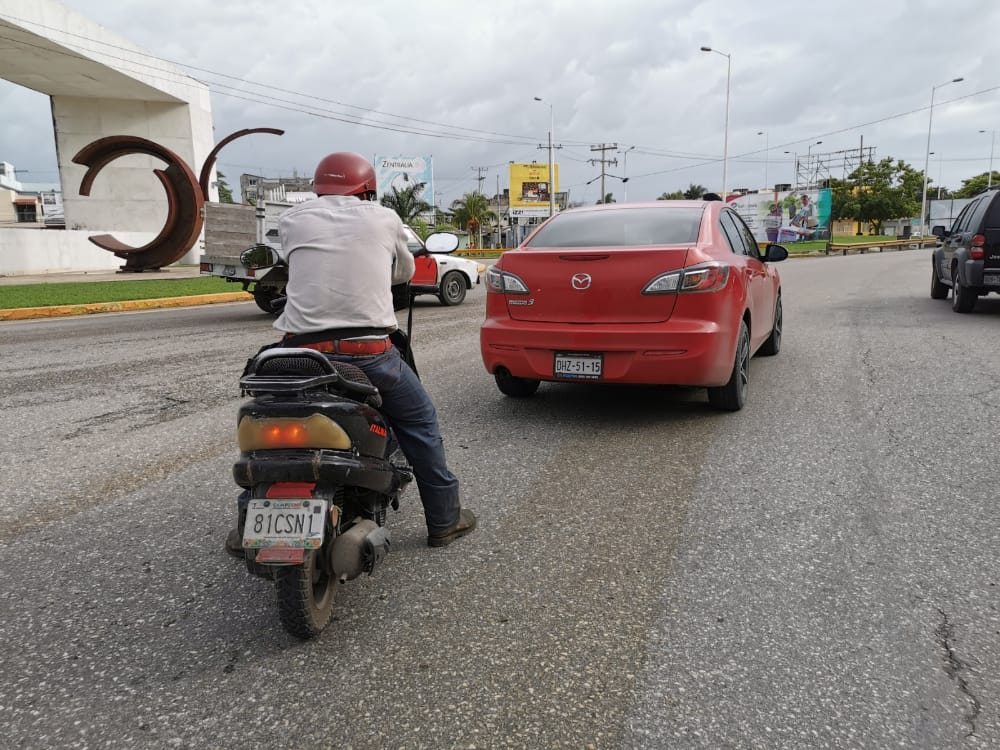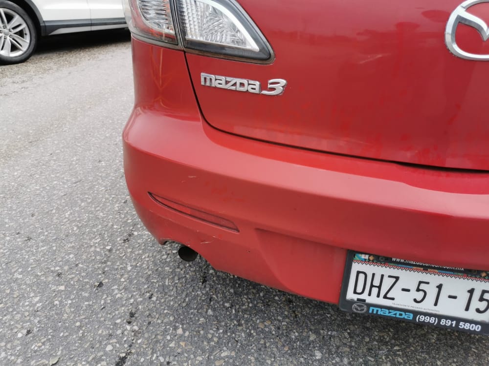El motociclista avanzaba detrás del vehículo pero metros antes de reincorporarse a la glorieta del Chechén, un tercer vehículo se le atravesó al Mazda rojo ocasionando que la conductora frenara de golpe pero sin dar tiempo a motorista de frenar el cual terminó colisionando la defensa trasera del particular, causándoles daños en pintura.