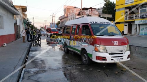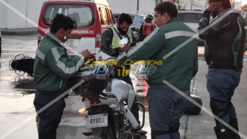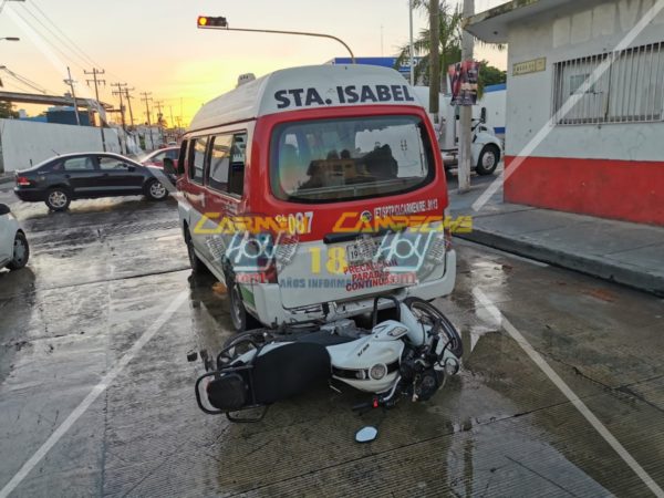 Los hechos ocurrieron alrededor de las 17:30 horas, sobre la calle 55 esquina con 56 de la demarcación antes mencionada, lugar donde el chofer de la camioneta urban, Nissan con número económico 087 y matrícula de circulación 19-47-BFC del estado de Campeche de la ruta Sta. Isabel, se encontraba detenido en el semáforo que marcaba luz roja, cuando repentinamente siente un fuerte golpe por atrás y al descender de la unidad se percató de que una motocicleta Italika, color blanco con matrícula de circulación 67EJR3 del estado de Guanajuato lo había impactado por alcance y el guiador estaba tirado en el pavimento, por lo que lo ayudó a ponerse de pie mientras daban parte a su respectivo seguros, cabe mencionar que la combi iba llena de pasajeros, sin embargo afortunadamente todos resultaron ilesos por lo que fueron trasbordados a otra combi colectiva para que continuarán con su camino.